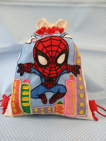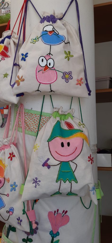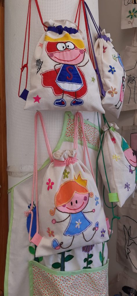 Mochilas de tela cosidas con diferentes dibujos personalizados.
